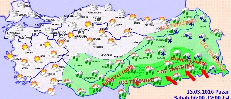 Meteoroloji Genel Müdürlüğü, 15 Mart Pazar hava durumuna ilişkin rapor yayımladı. Rapora göre; 19 il için sarı kodlu uyarı yapılırken, yağışların, Güneydoğu Anadolu, Doğu Akdeniz, Bingöl, Bitlis, Muş, Van'ın güneyi, Hakkari ve Şırnak çevrelerinde kuvvetli olmak üzere yağmur ve sağanak, yüksek kesimlerde kuvvetli karla karışık yağmur ve kar yağışı şeklinde olması bekleniyor. Rüzgarın, Güneydoğu Anadolu'nun güneyi ile Hatay'da fırtına şeklinde eseceği tahmin ediliyor.