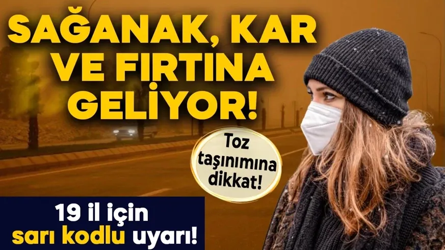 Meteoroloji, 19 il için sarı kodlu sağanak, kar, fırtına ve çöl tozu uyarısı yaptı. Doğu Akdeniz ile Güneydoğu Anadolu'da kuvvetli sağanak, Doğu Anadolu'da ise kuvvetli kar yağışı bekleniyor.