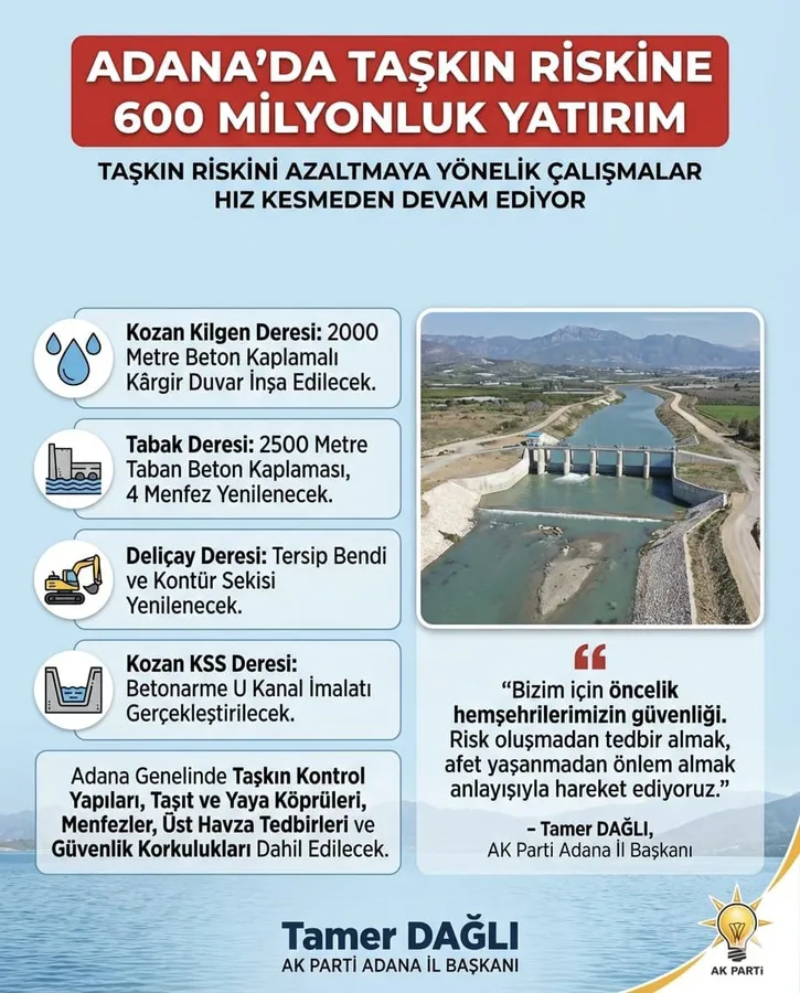 Adana’nın farklı bölgelerinde geçmişte yaşanan taşkınların vatandaşların can ve mal güvenliğini tehdit ettiğini hatırlatan İl Başkanı Dağlı, devletin tüm imkânlarıyla sahada olduğunu vurguladı. Çalışmaların Devlet Su İşleri 6. Bölge Müdürlüğü koordinasyonunda etap etap hayata geçirileceğini belirten Dağlı, “Bizim için öncelik hemşehrilerimizin güvenliği. Risk oluşmadan tedbir almak, afet yaşanmadan önlem almak anlayışıyla hareket ediyoruz” dedi.