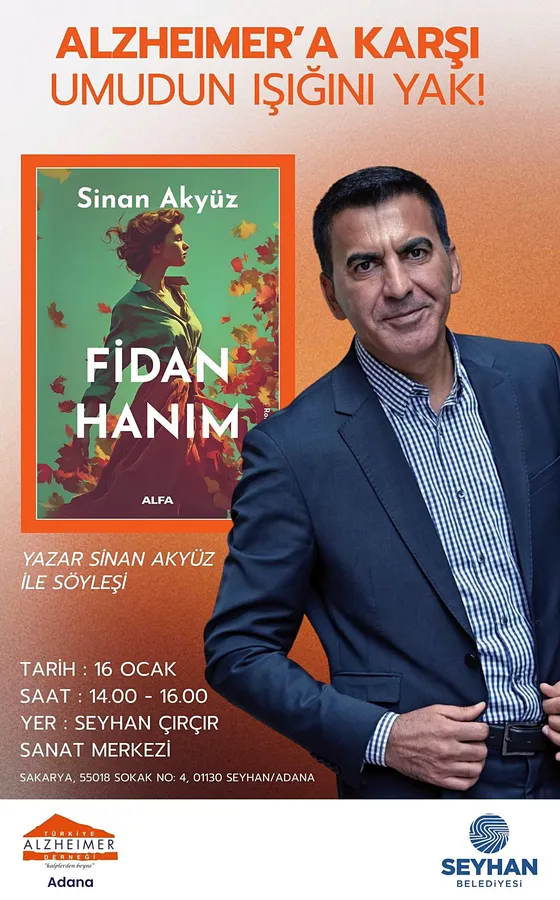 Söyleşiye Türkiye’nin önemli yazarlarından biri olan Sinan Akyüz katılacak. Cuma Günü 14:00-16:00 arası Seyhan Çırçır Sanat Merkezinde gerçekleştirecek söyleşi ücretsiz olacak. Söyleşi öncesi Türkiye Alzheimer Derneği Adana Şubesi Başkanı Prof. Dr. Ahmet Evlice de “Alzheimer Hastalığından korunmada kitap okumanın önemi” konusunda kısa bir sunum gerçekleştirecek.