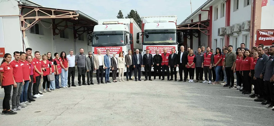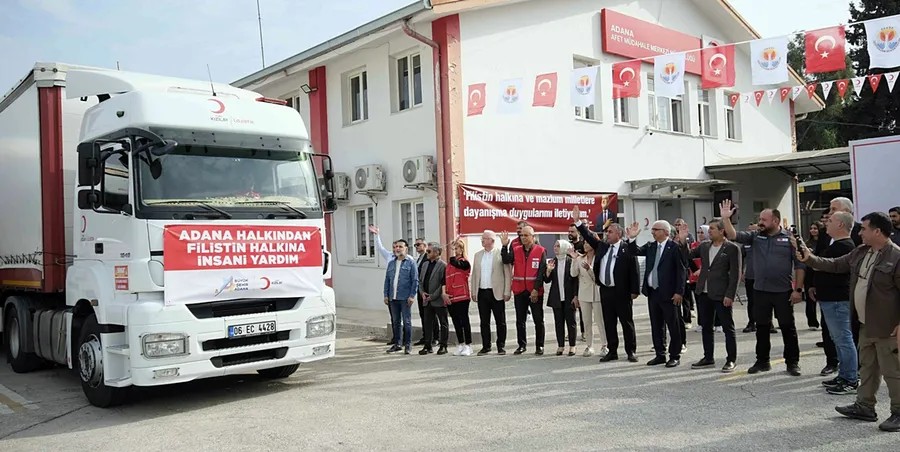 Konuşmaların ardından tırlar dualarla uğurlandı. Tırların üzerinde “Adana halkından Filistin halkına insani yardım’ pankartları yer aldı.