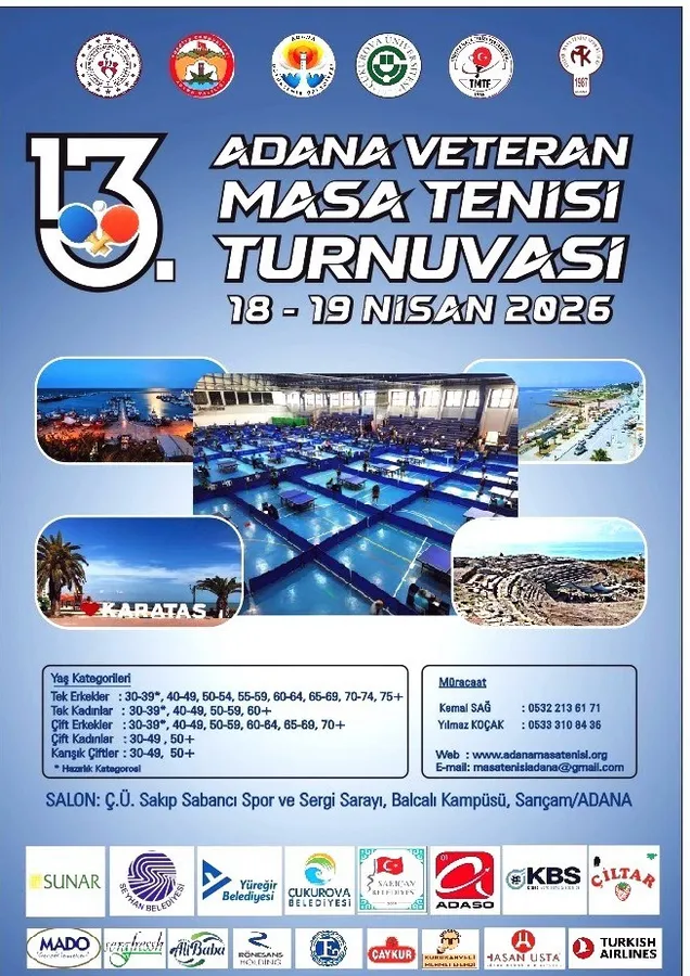 13.Veteranlar Masa Tenisi Turnuvası 18-19 Nisan 2026 tarihlerinde ÇİLTAR Adana Masa Tenisi Spor Kulübü tarafından Gençlik ve Spor İl Müdürlüğü ile Çukurova Üniversitesi’nin katkısıyla Çukurova Üniversitesi Sakıp Sabancı Spor ve Sergi Sarayı’nda 41 masada yapılacak.