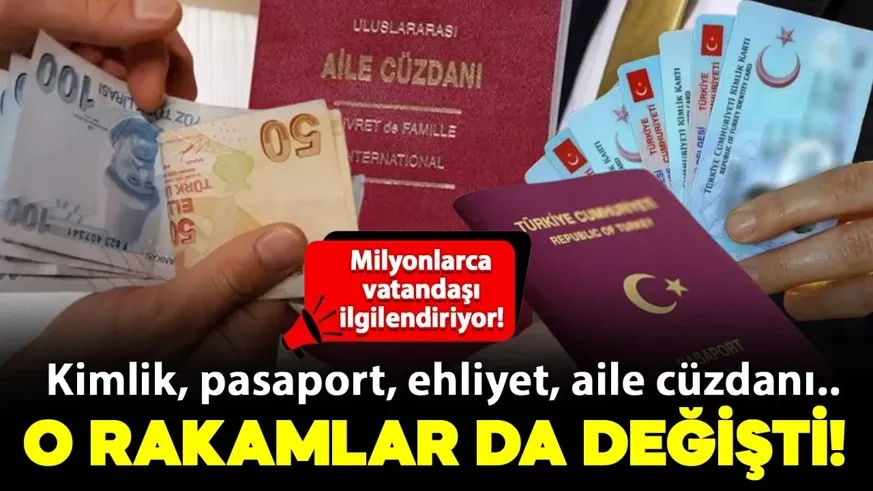 Aile cüzdanı bedeli 1202 lira olurken sürücü belgeleri ve sürücü çalışma belgeleri (karneleri) 1690 lira, motorlu araç tescil belgesi 1511 lira, iş makinesi tescil belgesi 1261 lira, banka çekleri (her bir çek yaprağı) 95 lira, mavi kart 220 lira, yabancı çalışma izni belgesi ve çalışma izni muafiyeti belgesi bedeli 964 lira olarak belirlendi.