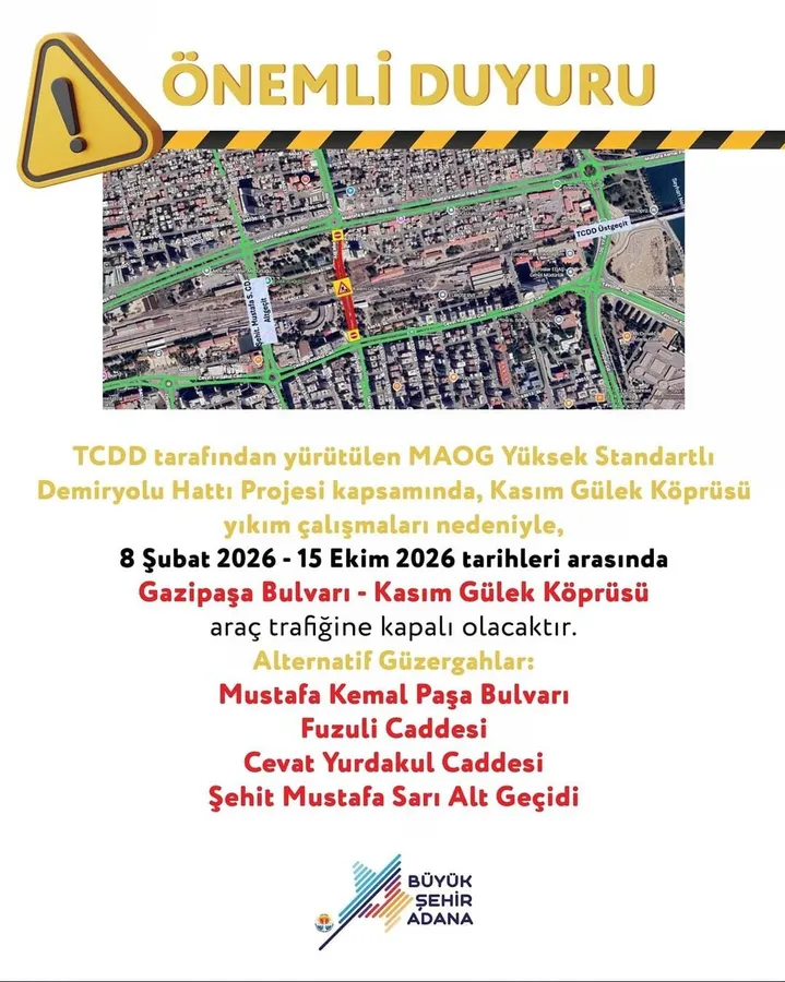 Adana Büyükşehir Belediyesi’nden yapılan açıklamaya göre, yıkım çalışmaları nedeniyle ulaşımda yaklaşık 8 ay sürecek geçici düzenlemeler uygulanacak. Gazipaşa Bulvarı ile Kasım Gülek Köprüsü arasındaki güzergah, 8 Şubat 2026 itibarıyla araç trafiğine tamamen kapatılacak. Çalışmaların 15 Ekim 2026’ya kadar sürmesi bekleniyor.