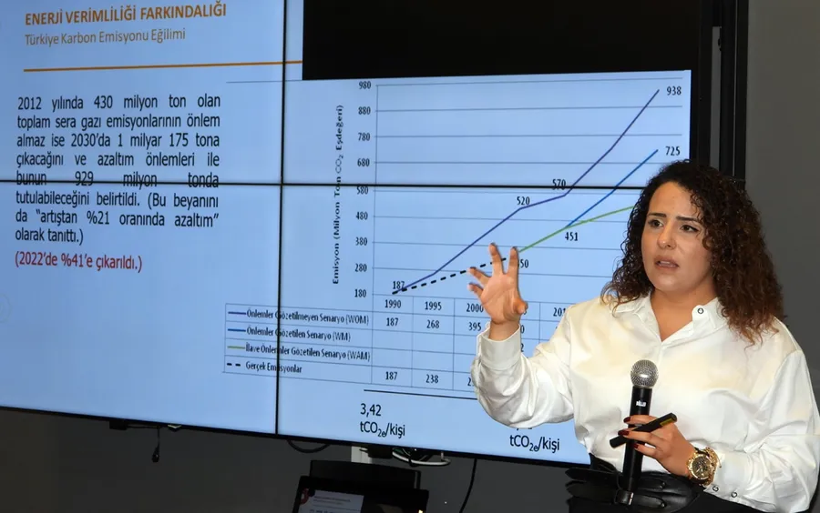 Doç. Dr. Demirdelen, binalarda enerji yönetim sistemlerinin (ISO 50001) uygulama adımlarını, enerji performans göstergelerinin izlenmesini ve bina bazlı karbon azaltım stratejilerini örneklerle anlattı. Ayrıca, Avrupa Yeşil Mutabakatı çerçevesinde geliştirilen yeni düzenlemelerin inşaat sektörünü doğrudan etkileyeceğini, firmaların bu dönüşüme uyum sağlayabilmesi için enerji verimliliği, kaynak döngüselliği ve dijital izlenebilirlik konularına odaklanmaları gerektiğini vurguladı.